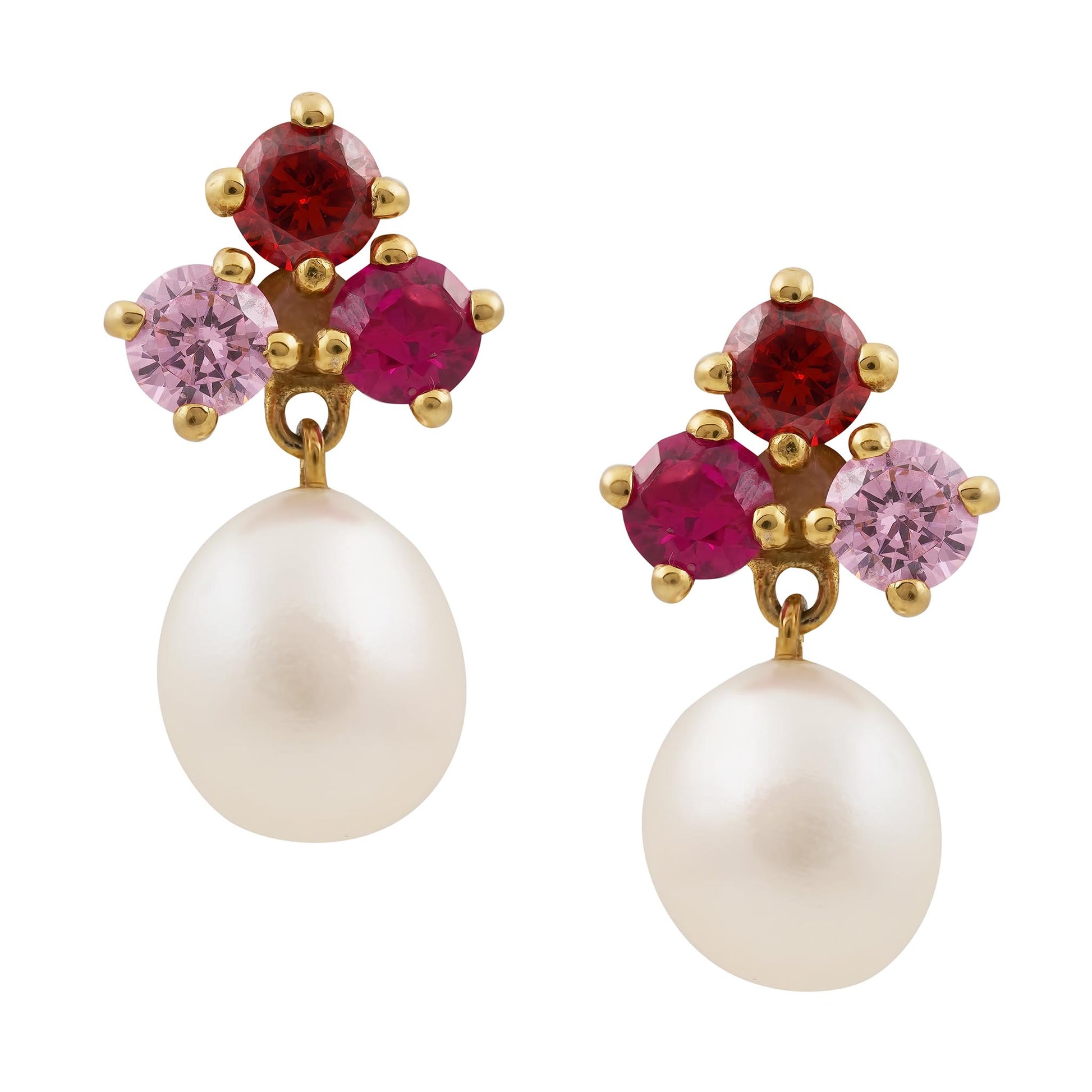 These elegant earrings feature a lustrous pearl paired with vibrant pink rubies, creating a beautiful piece suited for evening wear.